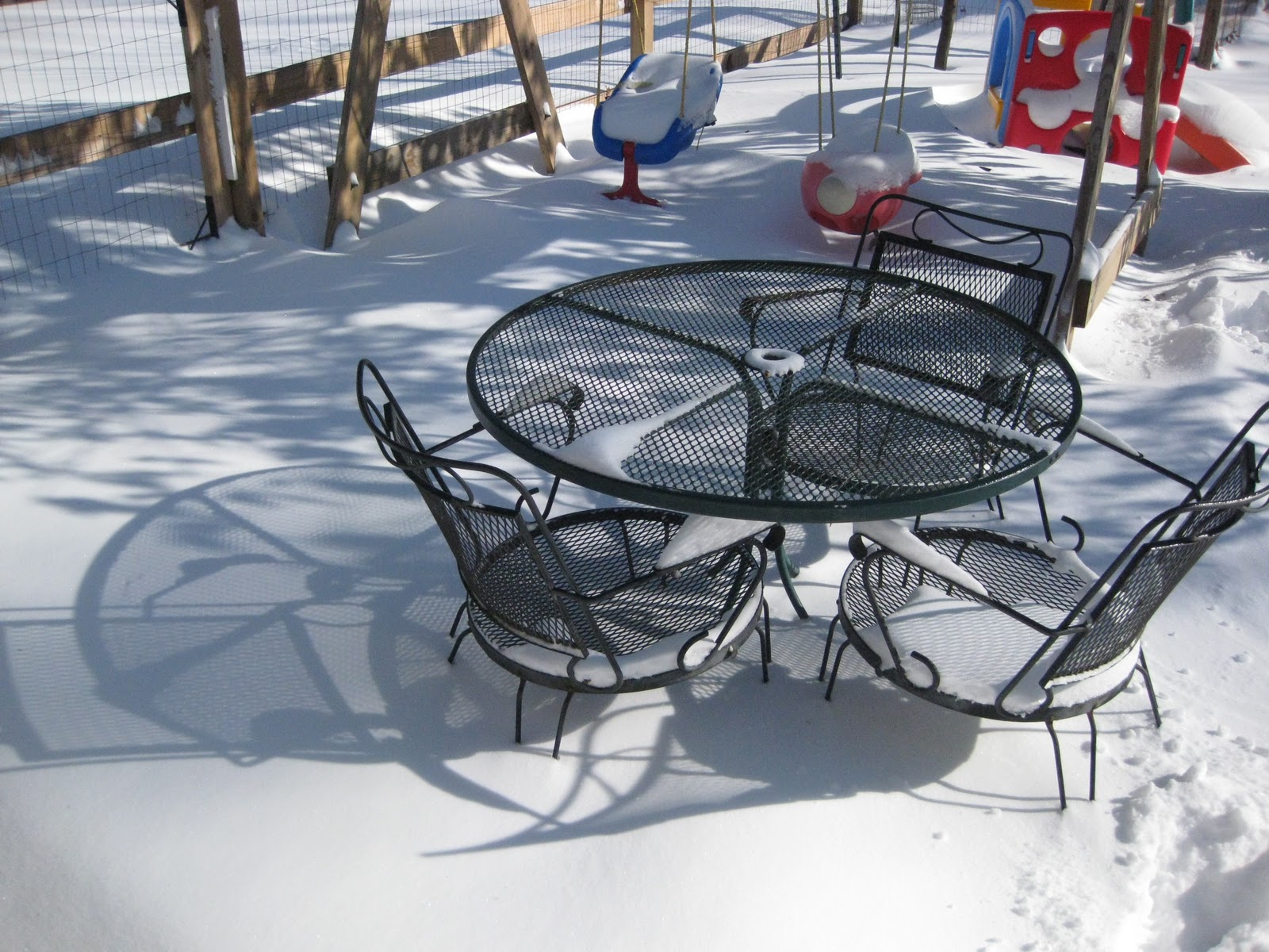 | Snow is only a couple inches below the seats of the chairs. |